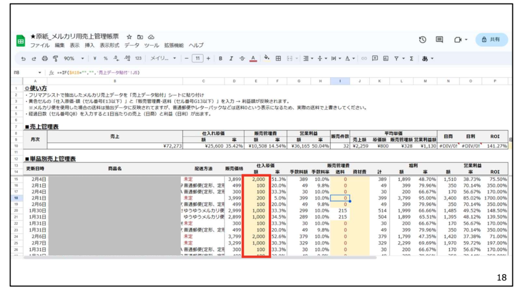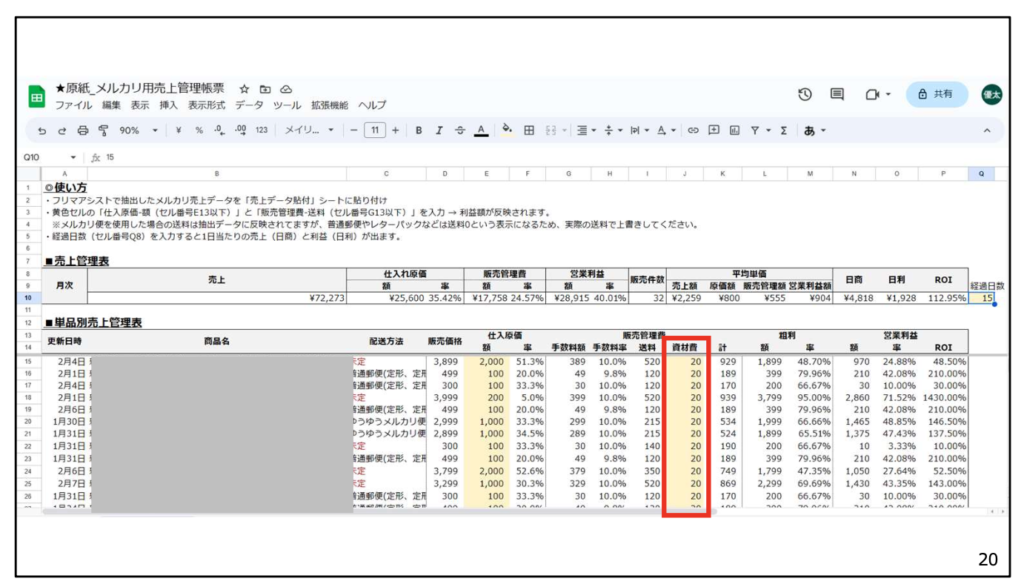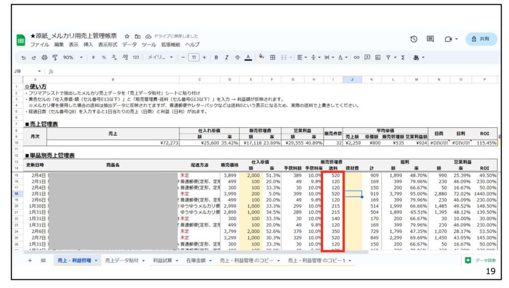 - STEP3黄色セル部分「販売管理費-資材費」を入力 資材費…ゆうパケットポストシール代/ゆうパケットプラスBOX代/宅急便コンパクト BOX代など OPP袋代や封筒代/購入して用意したダンボール代などはこちらに加味して単品ごとに管理するか、月次ごとの収支で購入時に一括管理するか、ご自身の分かりやすい方法で管理し てください。