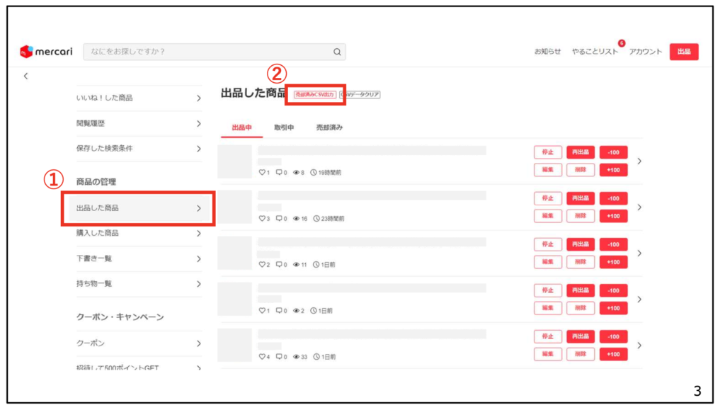 - STEP2マイページ画面左側①「出品した商品」をクリック