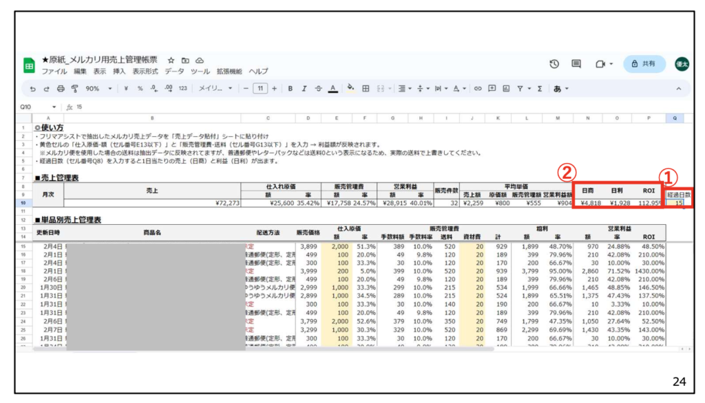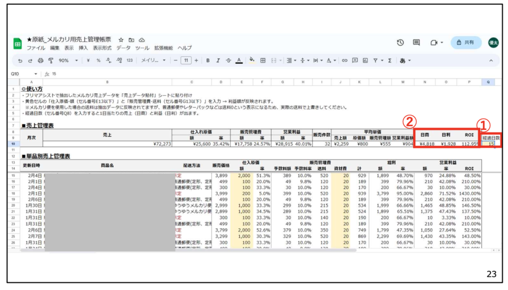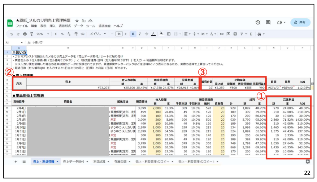 - STEP1最終的な営業利益/ROIが反映されていることを確認(①) 上部の月次売上管理表には全体の各金額・率と単品ごとの金額・率が反映されます。(②) - 仕入原価:販売した商品の仕入れ原価の合計