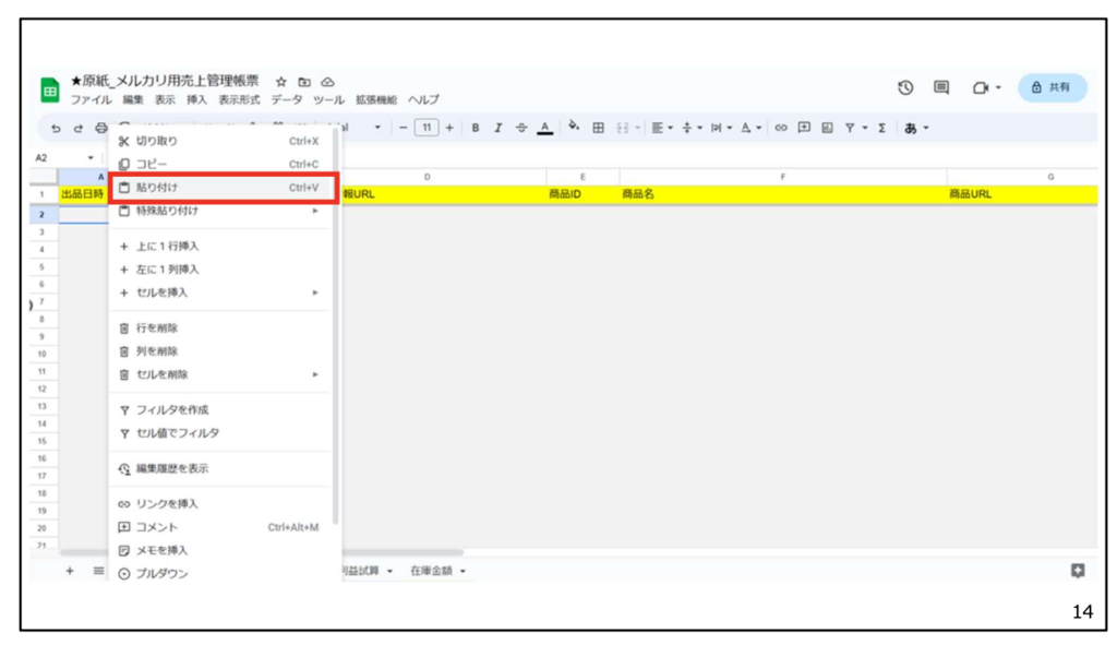 - STEP3加工データを 売上管理帳票へ 貼り付け右クリックし「貼り付け」をクリック(またはCtrl+V)で貼り付け