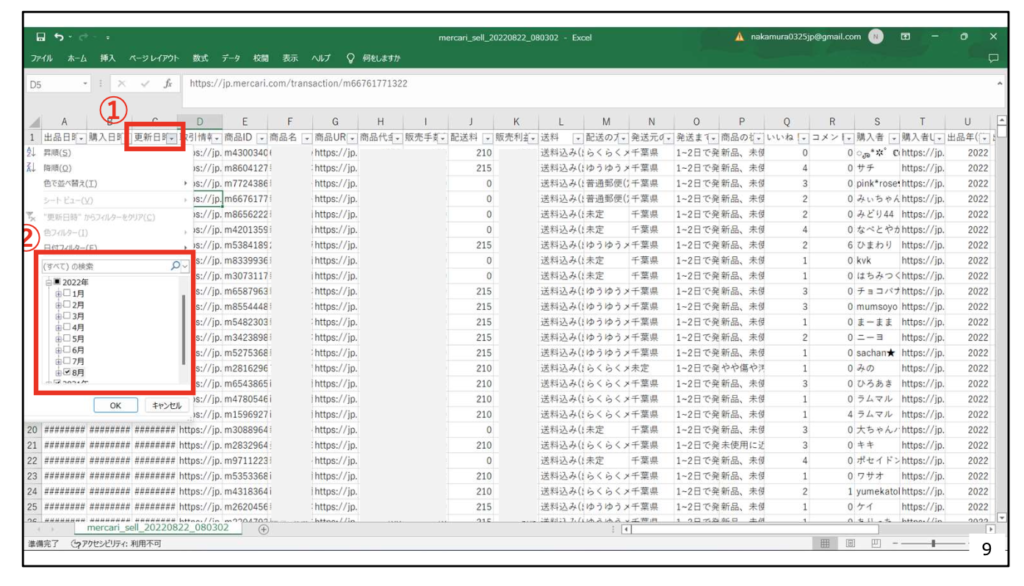 - STEP4更新日時が絞りたい月のみになっていることを確認(①)
